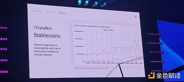 最后一个指标是稳定币的转账量。虽然在这方面 Solana 仍然落后于以太坊,但其增长速度惊人。大约一年前,Solana 的链上稳定币转账量是以太坊的 1/10 到 1/20,而今天它已经接近一半,这表明资金在 Solana 链上流动得越来越多。
