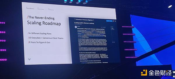 接下来,我想简要谈谈以太坊的扩展路线图。老实说,这个路线图已经多次改变,最早期的方案包括 Plasma 和状态通道等概念。如果你记得,那时还有像 Hyperledger 这样的疯狂想法。显然,这些都没有实现。最终,他们用了 5 年时间,在 2020 年 10 月正式决定采用以 roll-up 为中心的路线图。