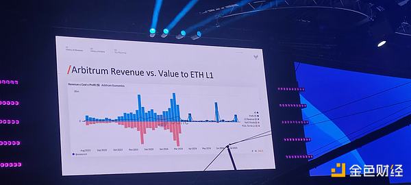 我想强调的一点是,虽然人们一直在说 L2 依赖 L1,但实际上,这张图表清楚地表明它们其实是对立的。Base 的目的很简单,就是为 Coinbase 的股东创造利润,他们想要最大化收入并最小化支出。而事实上,Base 的激励机制与以太坊 L1 的激励机制正好相反,因为 Base 希望尽量减少它支付的费用。如果我们再看看其他主要的 L2,比如 Optimism,图表显示的情况几乎是一样的,Arbitrum 也是同样的模式。在所有 L2 中,这种趋势是一致的。