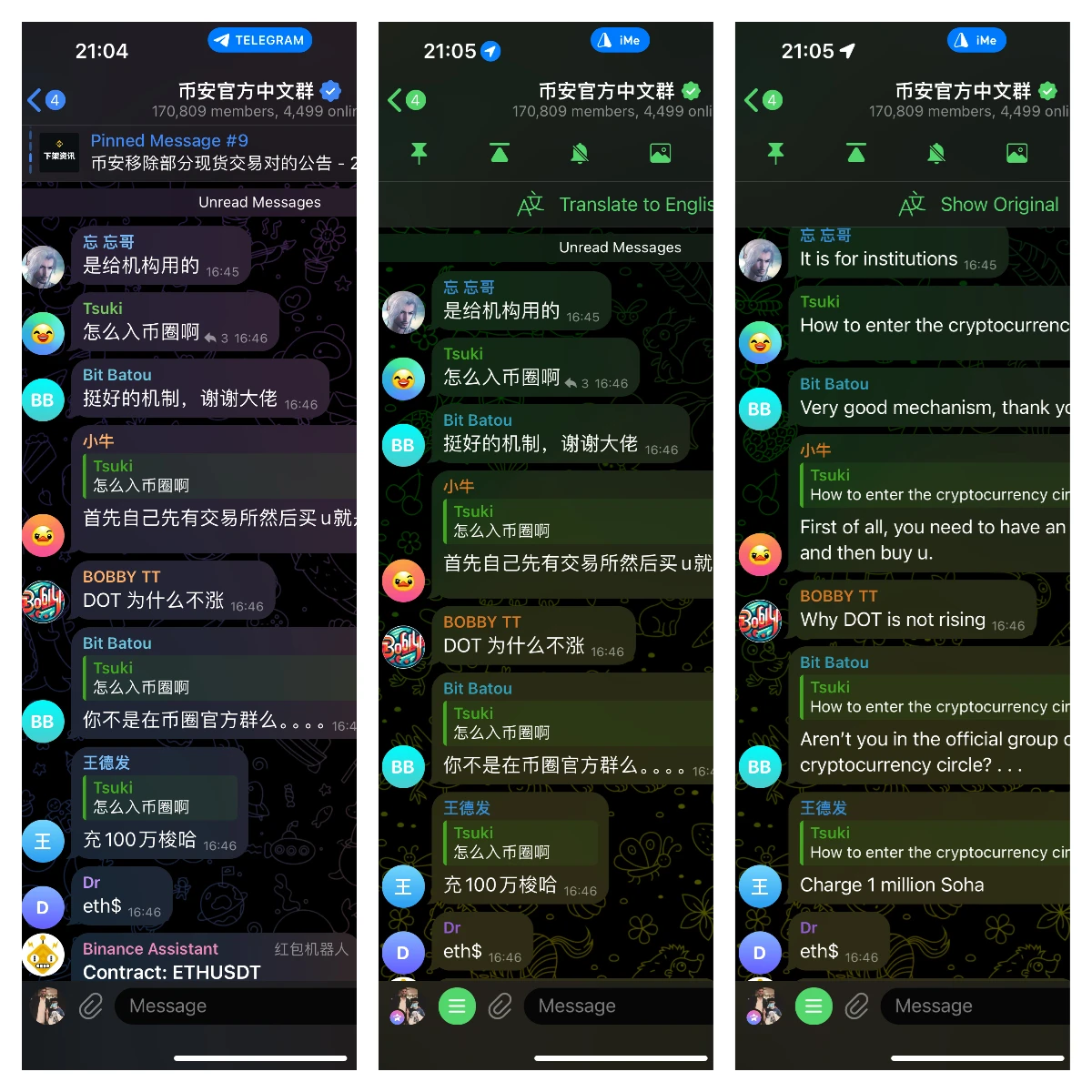 图片中我们可以看到,目前原始版本的 Telegram 对话中还不提供即时翻译功能,而 iMe 版本的 telegram 中用户已经可以直接使用整个群组对话一键翻译的功能。PC 版本也已更新直接一键翻译功能,这对于语言障碍的用户有着非常好的实用性。 由此可见,iMe 加强版的 TG 更像是Web3版本的微信生态系统类型