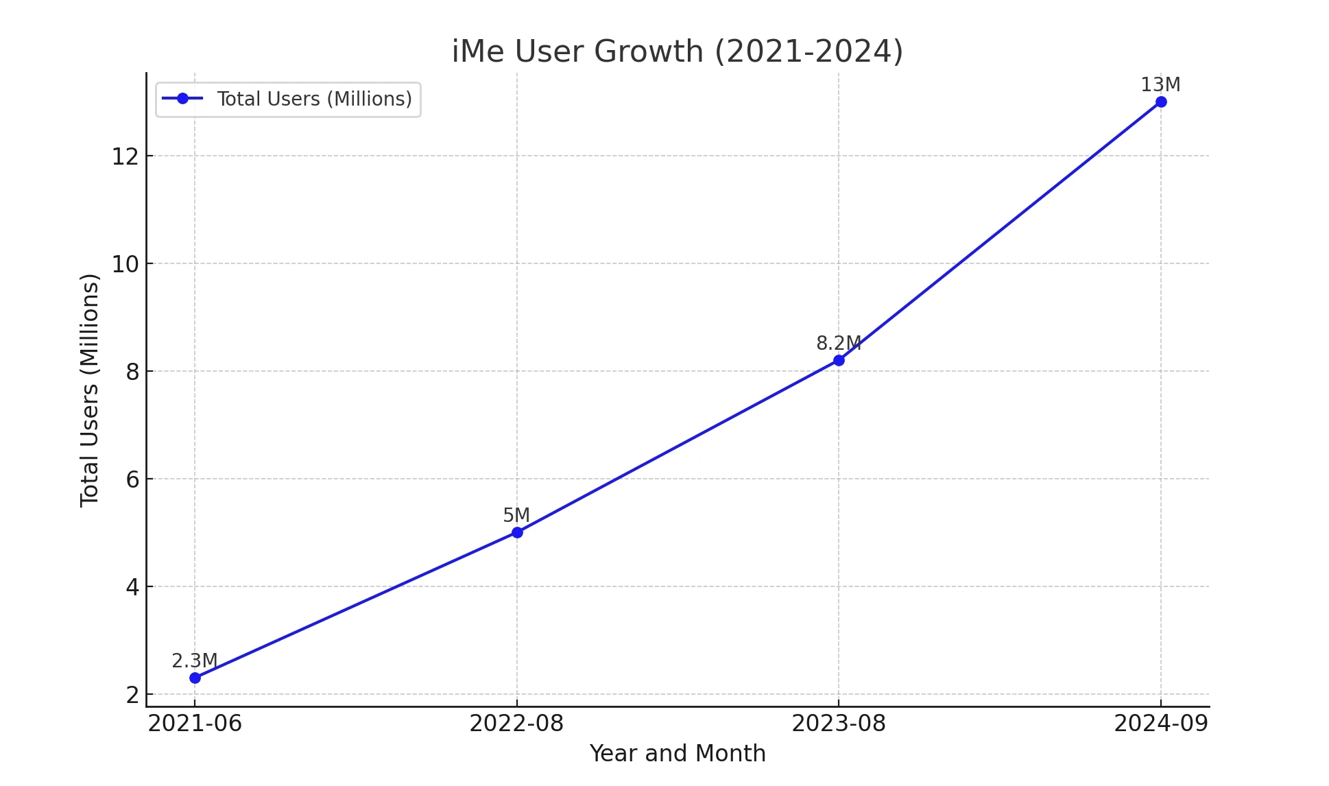 2021 年 6 月,iMe 的用户为 230 万,日活跃用户超过 20 万,截止 2024 年 9 月 目前 iME 已经拥有 1300 万的用户。3 年用户增长率达到 565% 左右。由于 iME 账户和 Telegram 账户完全通用,TG 的 9 亿用户也可随时无缝的使用 iMe 版本的 TG 软件。
