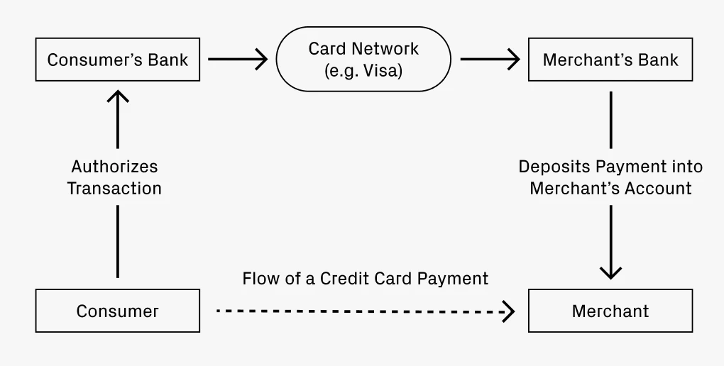 我们之前在信用卡中见过这种情况。消费者使用几乎可替换但实际上并不完全可替换的资产进行消费,这些资产作为美元(它们是对美元的贷款,但这些贷款不可同日而语,因为人们的信用评分各不相同)。有一些网络——如 Visa 和 Mastercard——负责整个系统中的支付协调。而且两个系统中的利益相关者(最终可能会)看起来相似:消费者、消费者的银行、商家的银行和商家。