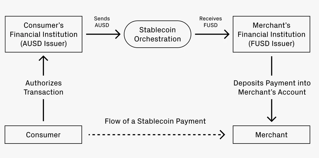 现在假如你想使用稳定币支付。你的银行,银行 A,发行 AUSD 稳定币。餐厅的银行,银行 F,使用 FUSD。这是两种不同的稳定币,虽然它们都代表美元。餐厅的银行仅接受 FUSD。那么 AUSD 的支付如何转为 FUSD 呢?