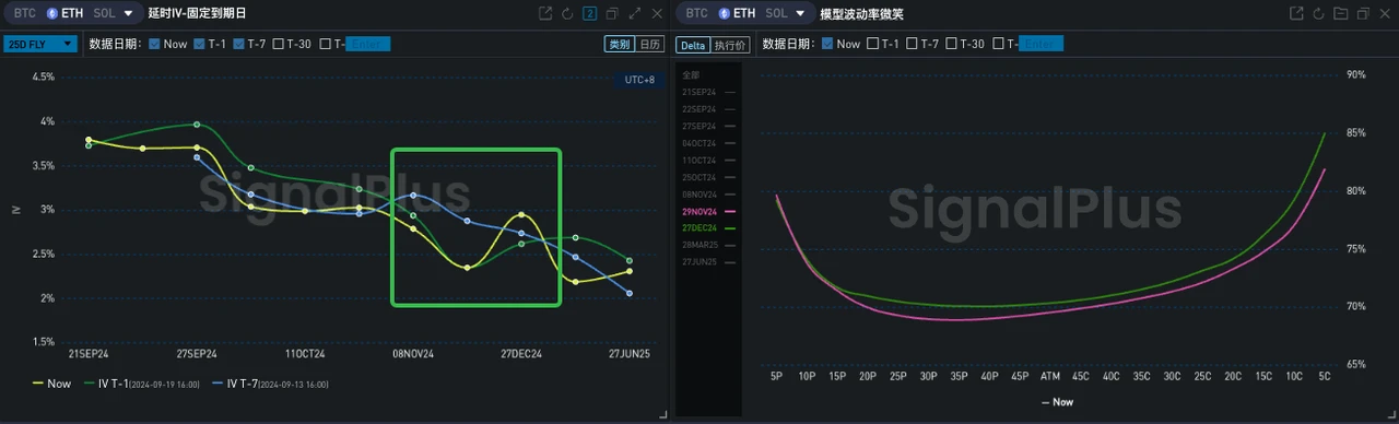 从曲率上看,BTC 与 ETH 在 29 NOV 上共同出现了低谷,并于次月的高峰形成鲜明对比,在 Wing 上留下了跨期的 Vol Premium 溢价。