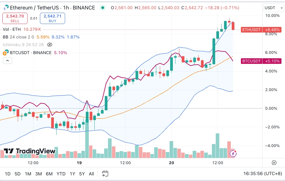 Source: TradingView, BTCUSDT vs. ETHUSDT 日内走势对比