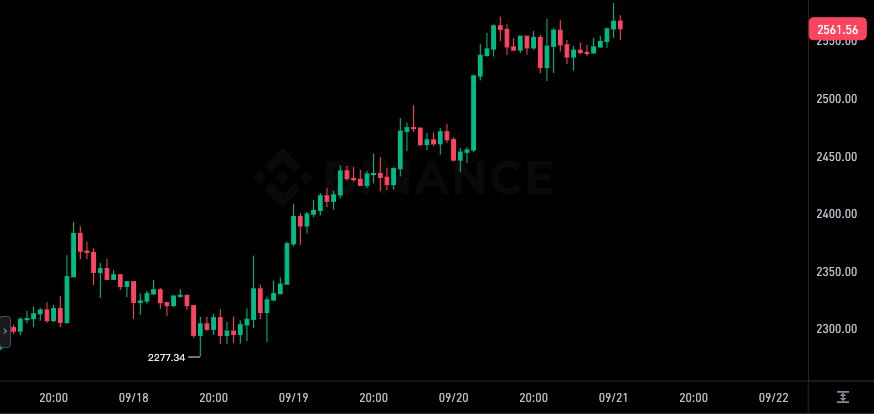 撰稿当下报 2,561 美元,近 24 小时上涨 4.64%。