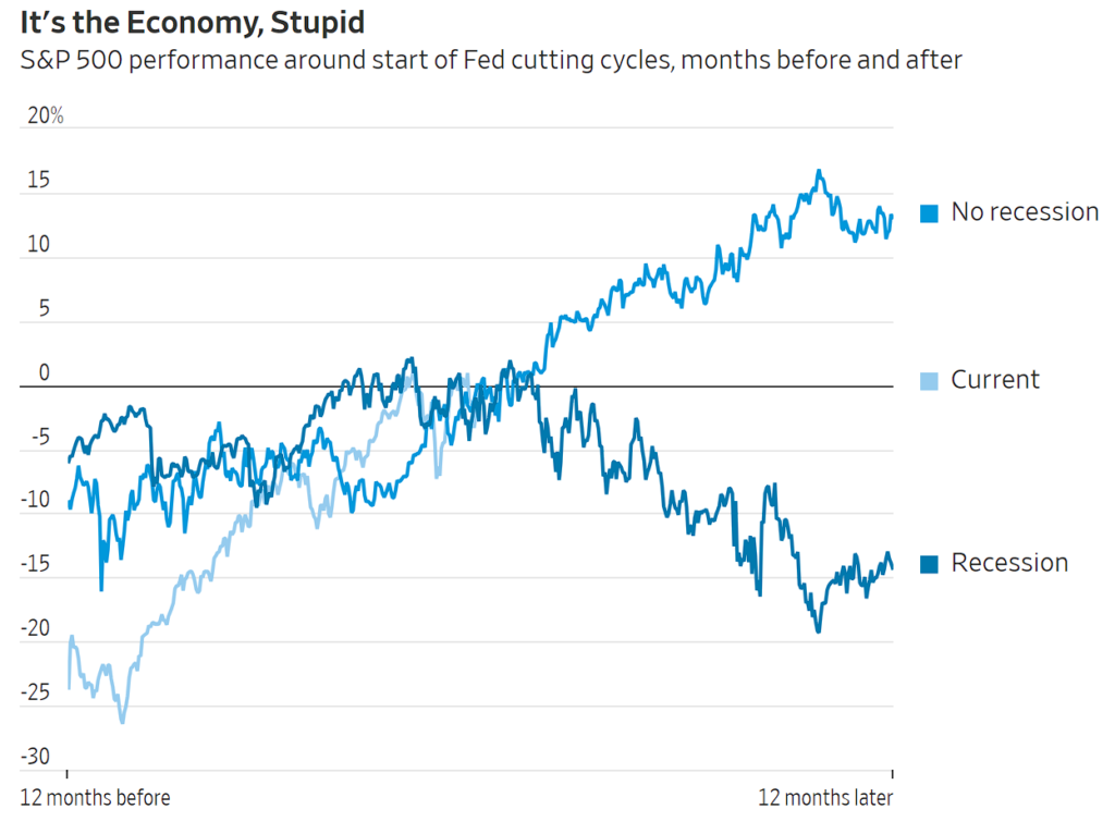 他也引用高盛策略师David Kostin 的研究指出,如果经济在降息前就出现实质衰退,那麽无论中间涨跌波动如何,最终标準500指数的中位数路径,就会往下调整 14 %;反之没有衰退的会,则是往上调整 14%。