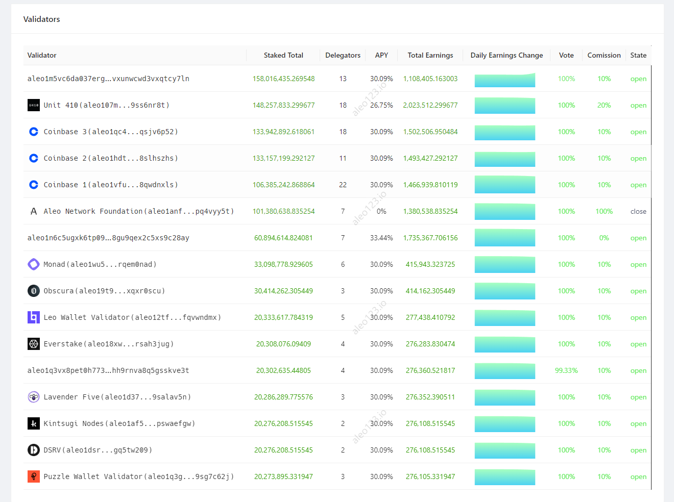 截至 9 月 20 日数据显示,最多的验证者已获得超过 110 万枚 Aleo 代币,最少的验证者获得超过 27 万枚。而验证者当中,Coinbase、unit410、Aleo 基金会等投资人或项目方关联机构占到了大多数。