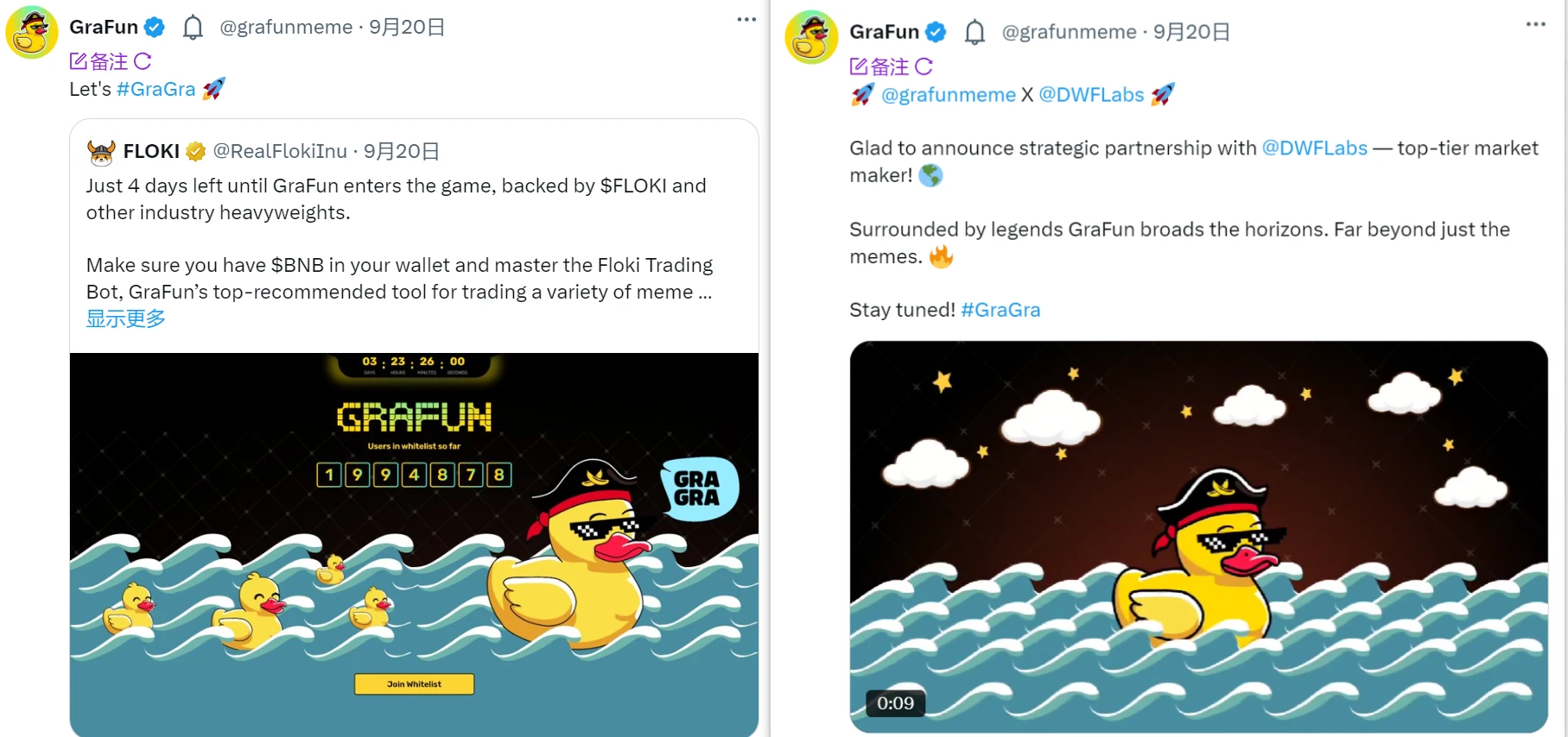 9 月 2 日,Pump 类平台 GraFun 推出了注册与存款活动。一天后,官方宣布已有 50 万名用户进行了注册。此后在 9 月 20 日, GraFun 宣布获得了 DWF Labs 和 Floki 的支持 ,社区开始大范围推广这一项目,当前注册地址突破 239 万个。