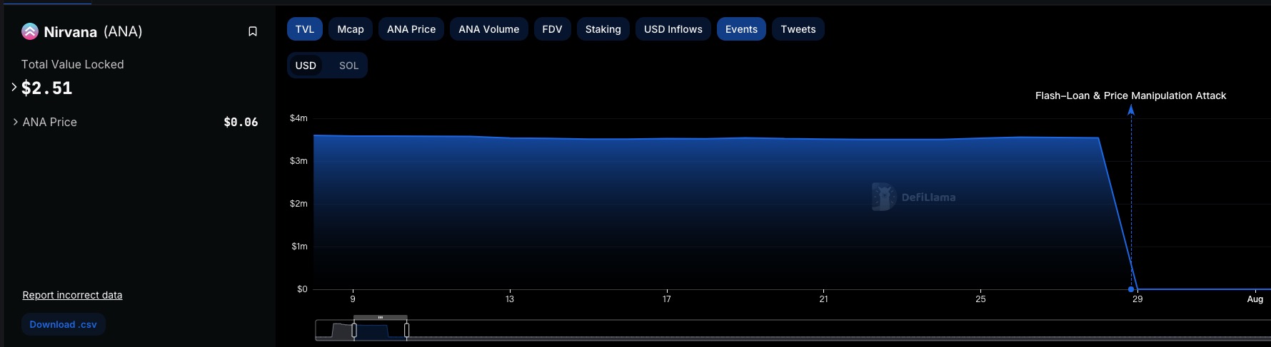不知道有多少小伙伴了解这个项目,在这里先简单描述一下整个事件的背景信息。首先Nirvana Finance是Solana上的一个算法稳定币项目,在这里就不展开讲了。这个项目在2022年年初启动,并且在2022年7月28日被黑客攻击,并盗走了协议中稳定币NIRV的所有抵押品,大概350万美金。具体攻击的细节也很有趣,由于该项目的合约并没有开源,而黑客仍然可以借助Solend的闪电贷功能获利,当时也一度当其团队面对了不少关于监守自盗的指控。
