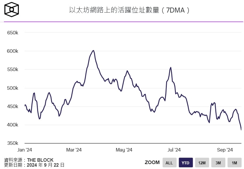 相比之下,虽然以太坊(ETH)价格也持续上涨,但根据 The Block 报导 数据,该网路上的活跃帐户数却降至年内最低点,约为 385,000,这一数字是自 2023 年 12 月以来的最低值。