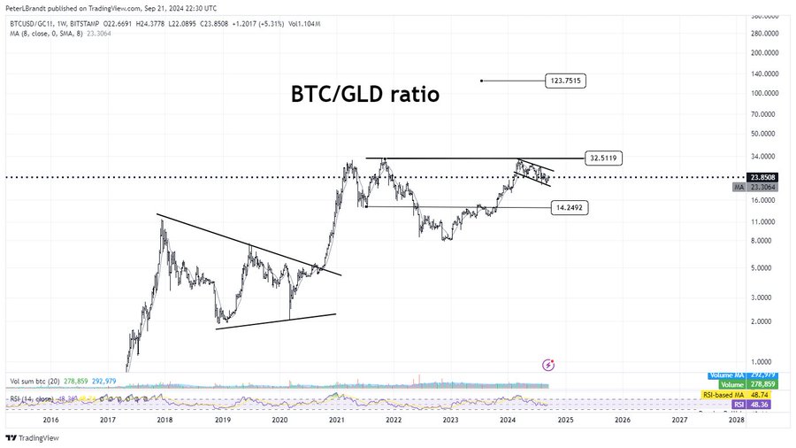 他预测,1 BTC 的价格最早可能在 2025 年达到 123 盎司黄金,这与 2024 年 9 月 22 日的 24 盎司相比,将实现超过四倍的涨幅。