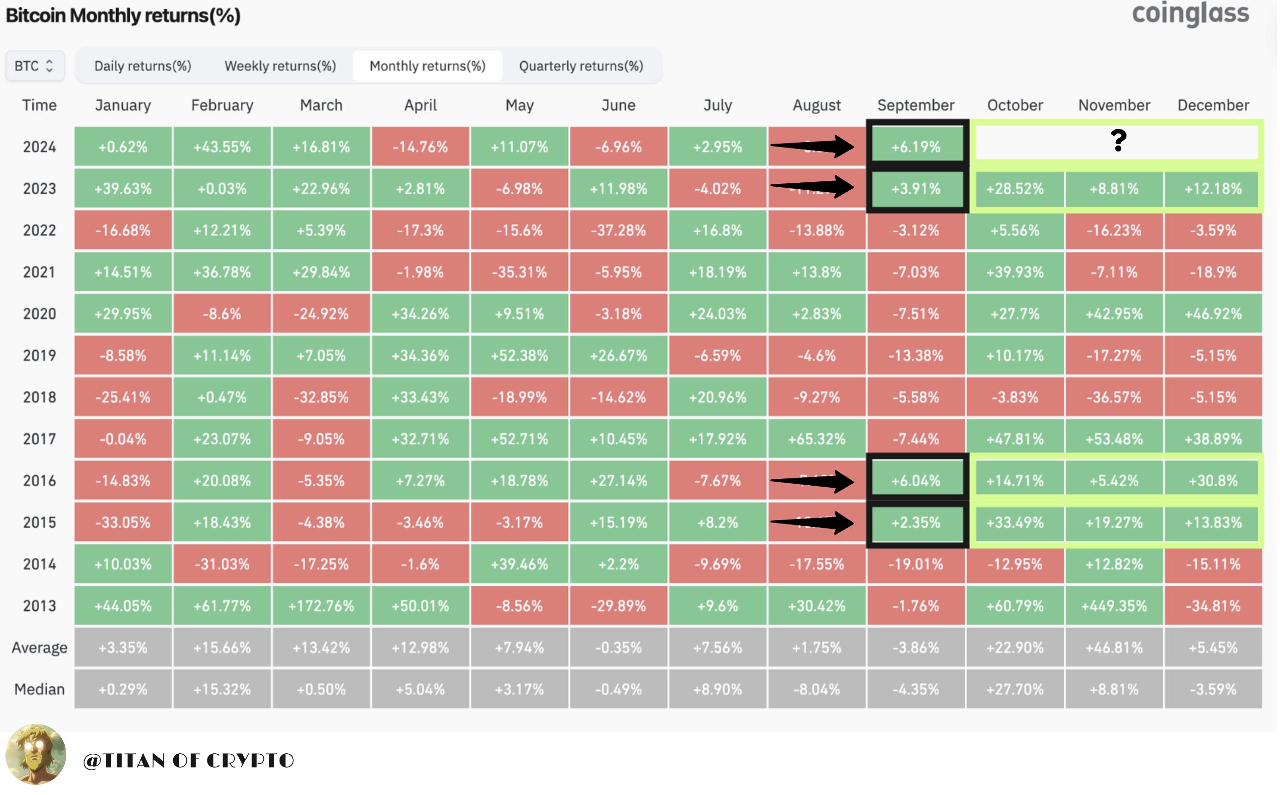 他还补充道:「历史数据显示,当 9 月收绿时,第四季度通常呈现强劲的上升趋势。如果比特币能够在本月收于 59,000 美元以上,年底牛市可期。」