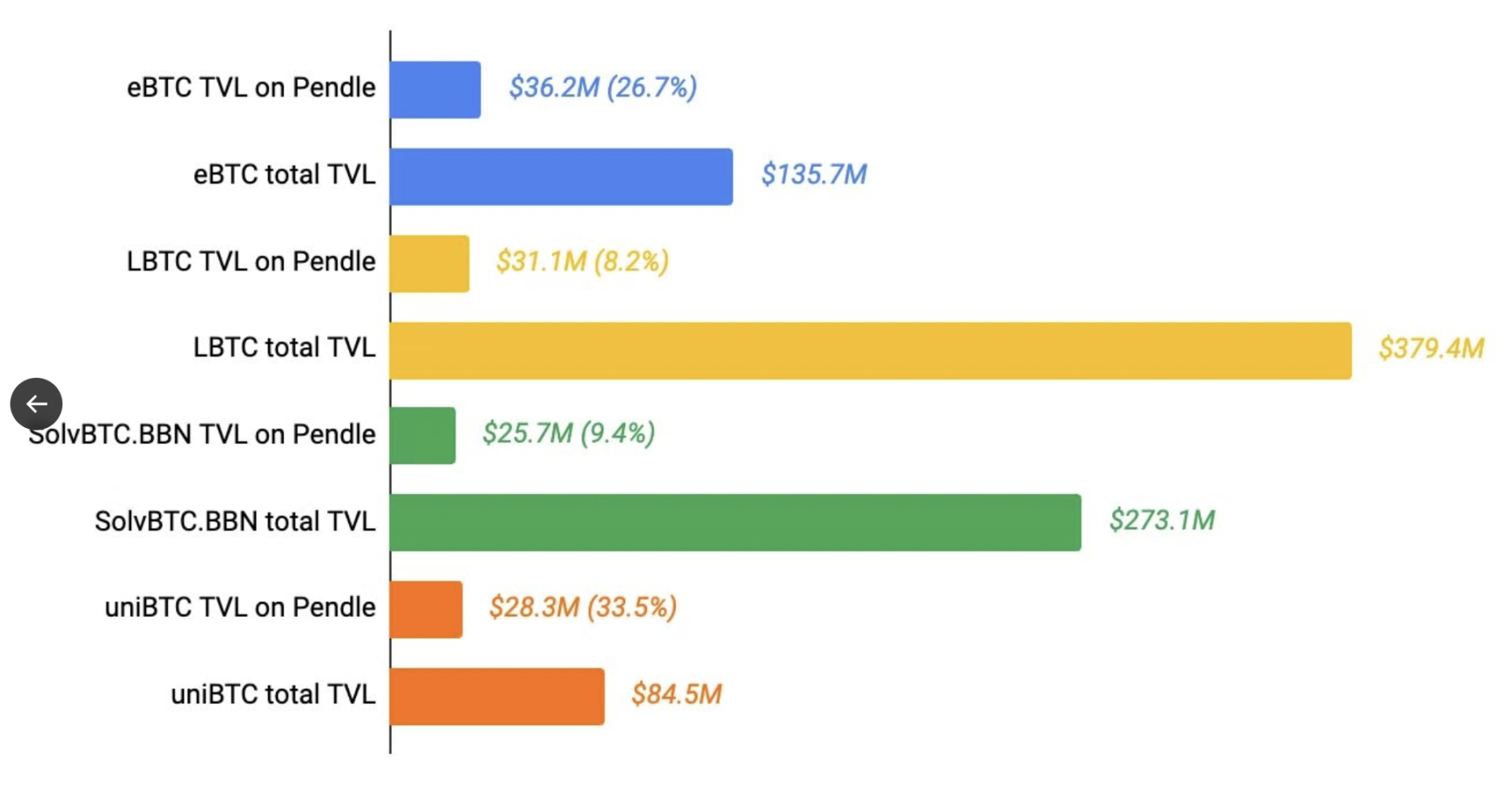 近期,Pendle 已陆续将四种 BTC LST 集成到其积分市场中,包括 $LBTC、$eBTC、$uniBTC 和 $SolvBTC.BBN。当前各 LST 在 Pendle 上的流动性和总 TVL 情况如图所示。其中,$LBTC 的实际采用情况高于 LBTC (Corn) 池中的表面数值。由于 37% 的 $eBTC 由 $LBTC 支持,Pendle 对 $eBTC 的集成也会让 Lombard 间接受益,从而使 $LBTC 持有者拥有更多优化收益策略的机会。