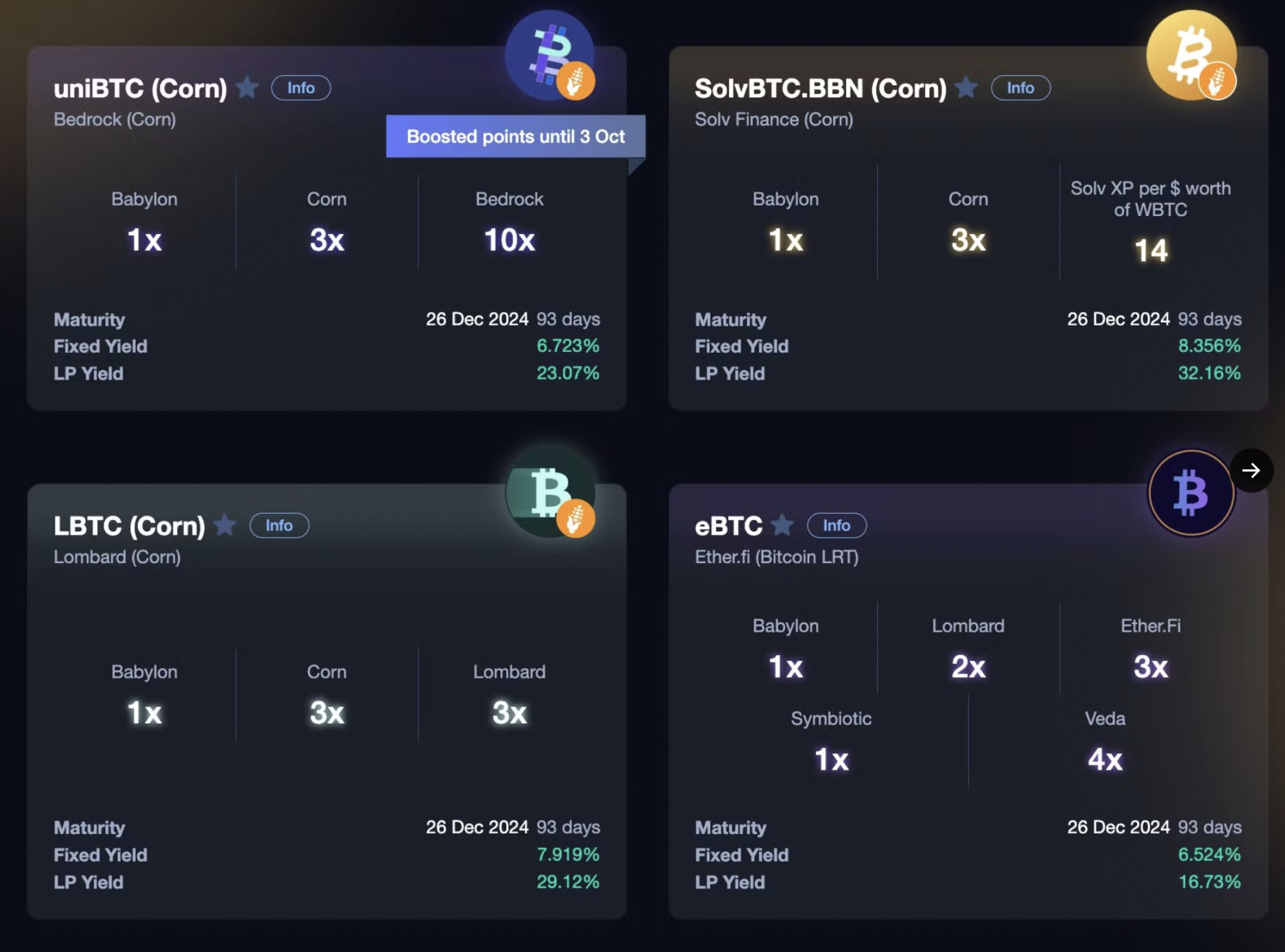 未来集成路径可能为:Wrap BTC → BTC LST → BTCN → DeFi。这种架构为 BTCFi 系统增加了另一层套娃杠杆,虽然使用户能够在更多协议中实现一鱼多吃,但同时也引入了新的系统性风险,以及各协议的 points system 被过度挖矿最终收益远不及预期的可能性。Corn 和 Lombard 的积分释放情况可参考:https://x.com/PendleIntern/status/1835579019515027549