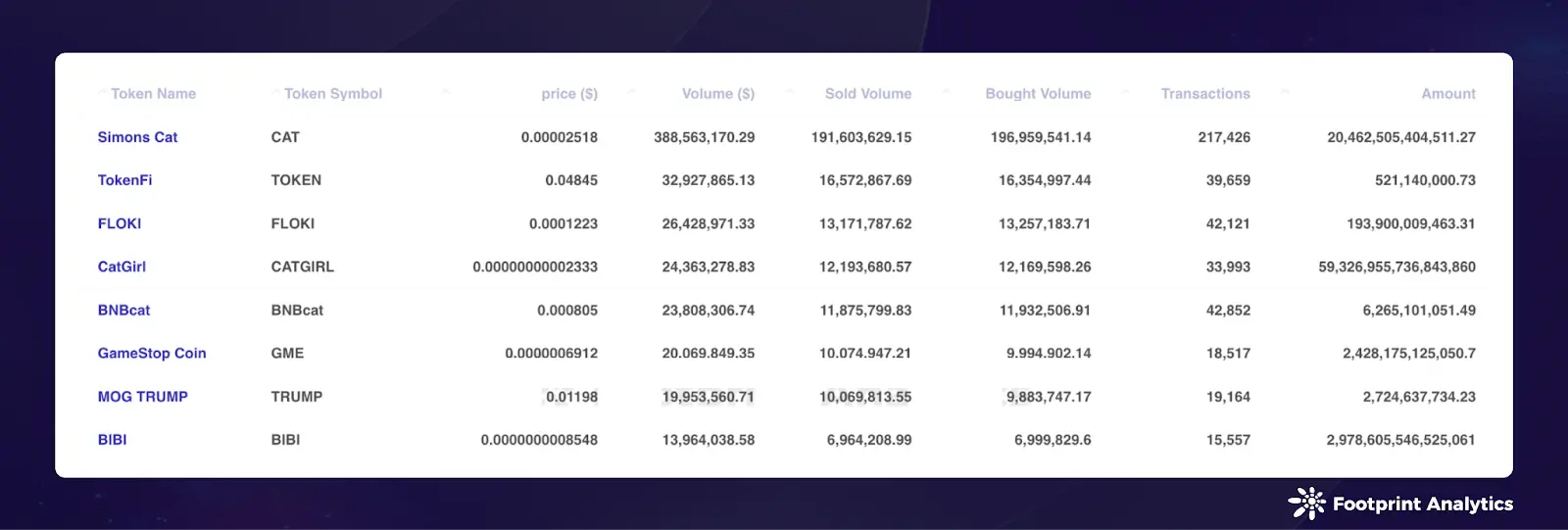BNB 链也推出了新的政策和激励措施,以促进链上 Meme 相关活动,其中 Simon’s Cat、TOkenFi 和 FLOKI 在过去 30 天的交易量中领先。