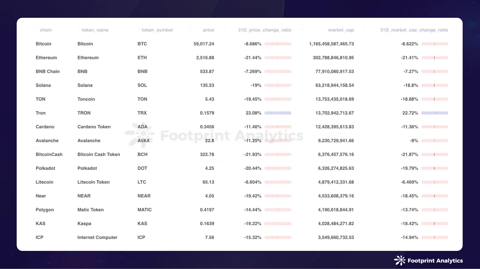 在市值排名前 15 的链中,Tron 是唯一在本月实现代币价格与市值双增长的链,TRON 的价格上升了 23.1%,市值增长了 22.7%。相比之下,其他链则呈现下降趋势。