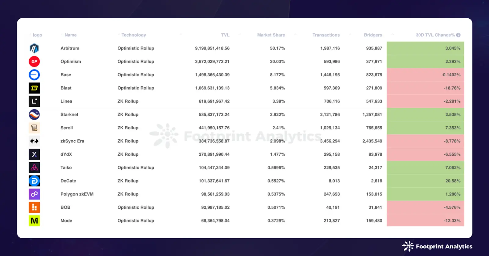 Arbitrum One 、 Optimism 和 Base 在 TVL 市场份额方面继续占据主导,分别持有 50.2%、20.0% 和 8.2% 的份额,与上月相比 TVL 变化不大。