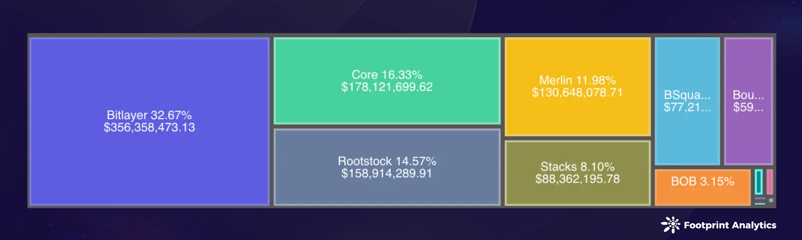 Bitlayer 在该领域领先,占据了总 TVL 的 32.7%,其次是 Core ,占比为 16.3%, Rootstock 占 14.6%, Merlin 占 12.0%。