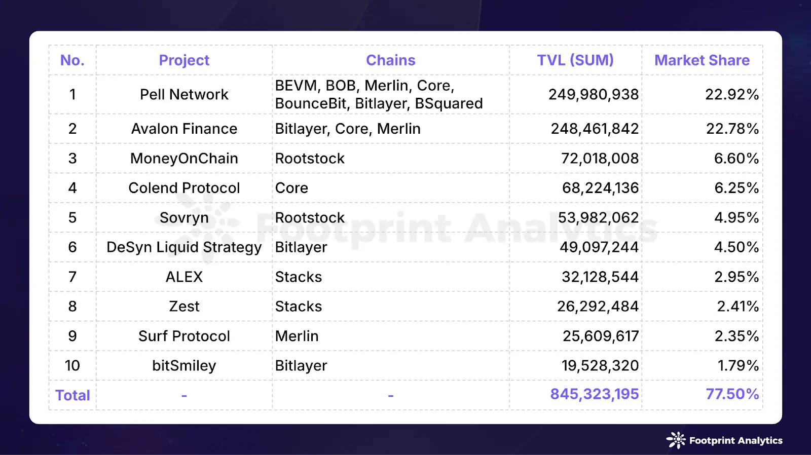 在单一链上的 DeFi 项目个体来看,前 10 名项目占总 TVL 的 64.6%,其中 Avalon Finance(Bitlayer)、Pell Network(Core)和 MoneyOnChain(Rootstock)位居前列,分别占据了 16.7%、7.2% 和 6.6%。