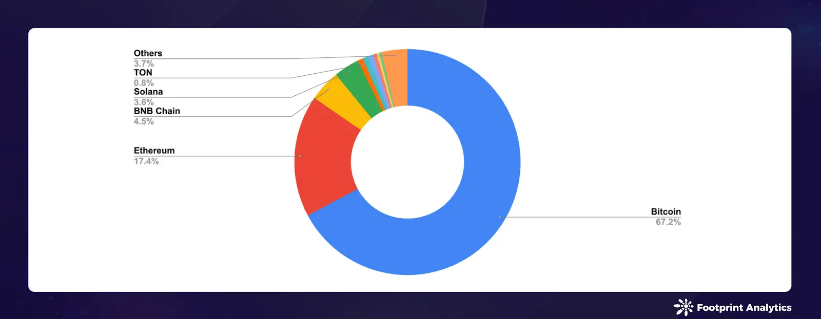 截至 8 月底,区块链加密货币的总市值相比 7 月末下跌了 12.1%,定格在 1.74 万亿美元。市场依然由 比特币 、 以太坊 、 BNB 和 Solana 牵引,它们的市场份额分别为 67.2%、17.4%、4.5% 和 3.6%。特别值得关注的是,比特币的市场份额绝对值增长了 2.4%,而以太坊的市场份额则下降了 2.3%。