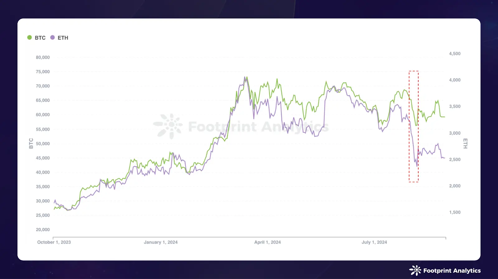 8 月份,比特币和以太坊均出现了显著的下跌。日本央行于 7 月底意外宣布加息,这一举措在各市场引发了连锁反应。诸如短期波动性策略和外汇套利交易等策略的回报率显著下滑,导致 8 月第一周加密货币价值大幅下跌。比特币和以太坊均在 8 月 7 日触及本月最低点。