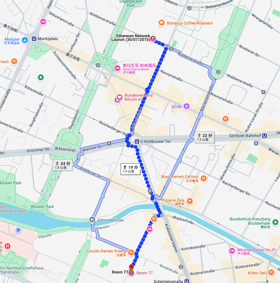 在这个区域附近,以太坊租了一个办公室,距离「Room 77」餐吧只有 1.5 公里,Vitalik 走路不出 20 分钟就能到。现在在谷歌地图搜索以太坊办公室的地址「Waldemarstraße 37A, 10999 Berlin」,还能看到这个地址被标注上了 Ethereum Network Launch (30/07/2015),以及当时以太坊核心早期成员的合影照。
