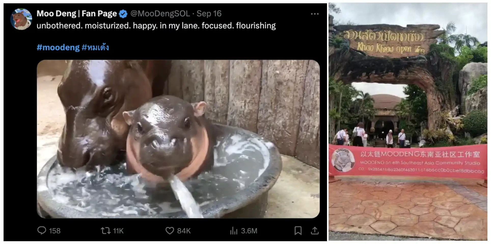 9 月,一只丑萌河马 Moo Deng 火遍全网,成为各路媒体头条,其诞生于一家泰国开放动物园 Khao Kheow,只有两个月大的 Moo Deng 因为一张特色脸庞和有趣的视频成为新的社交媒体宠儿。
