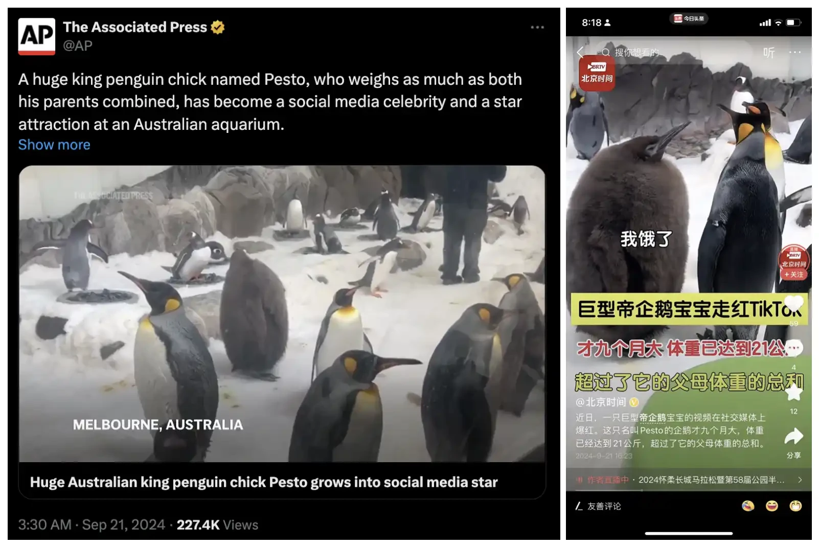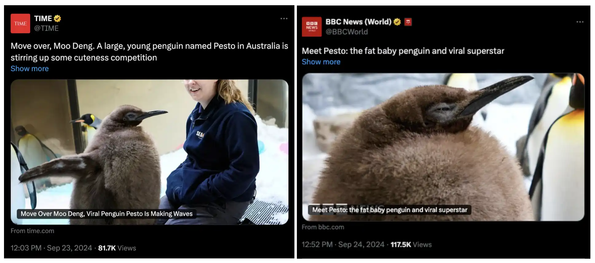 在 Moo Deng 爆火期间,另一只来自澳大利亚的萌物巨型帝企鹅 Pesto 也因为体型而出圈,Pesto 的体重相当于其父母的总和,在企鹅群里十分显眼,从而登上了各大传统媒体,得益于怪异的自身特性加上社交媒体的发酵与传播,然后币圈开始出现相关 meme 币,受到市场的追捧。