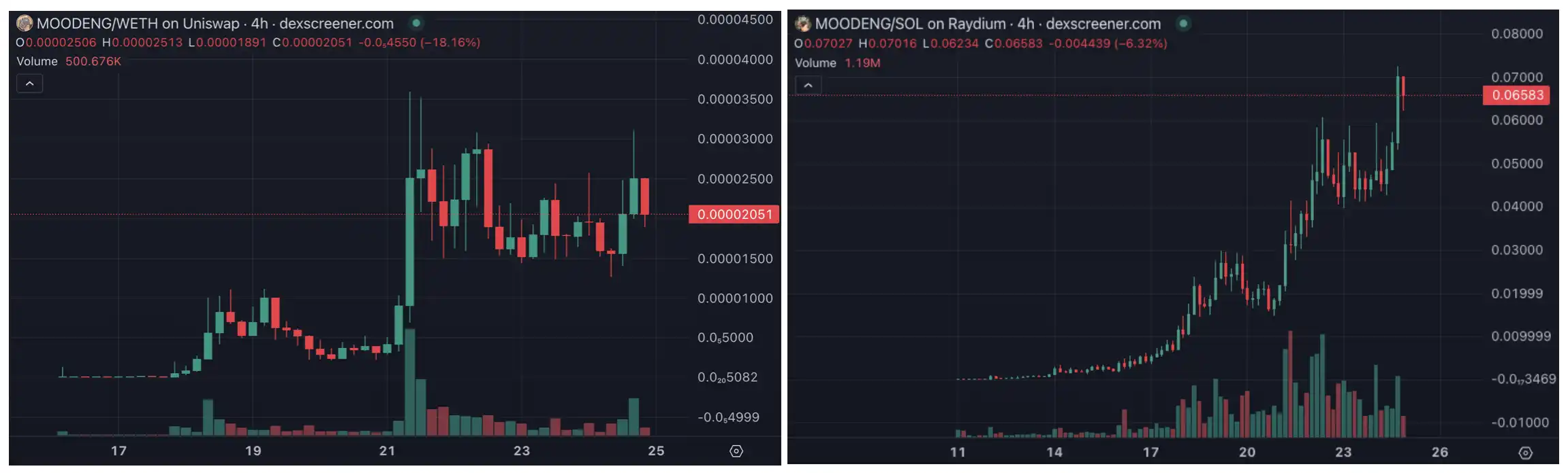 Moo Deng 的病毒式传播还在继续,Solana 和以太坊上同名 meme 交易量第二波大涨发生在 9 月 21 日。但在这一波涨势后,Solana 上的标的维持住了上涨形态,而以太坊上的 MOODENG 涨幅趋势较为平缓。