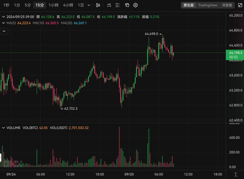 比 特币在昨日晚间 22:00 短暂插针 62,700 美元之后再度反弹冲高,今(25)晨接近 7 点左右最高来到 64,698 美元,似乎很快就要挑𢧐 65,000 美元大关。
