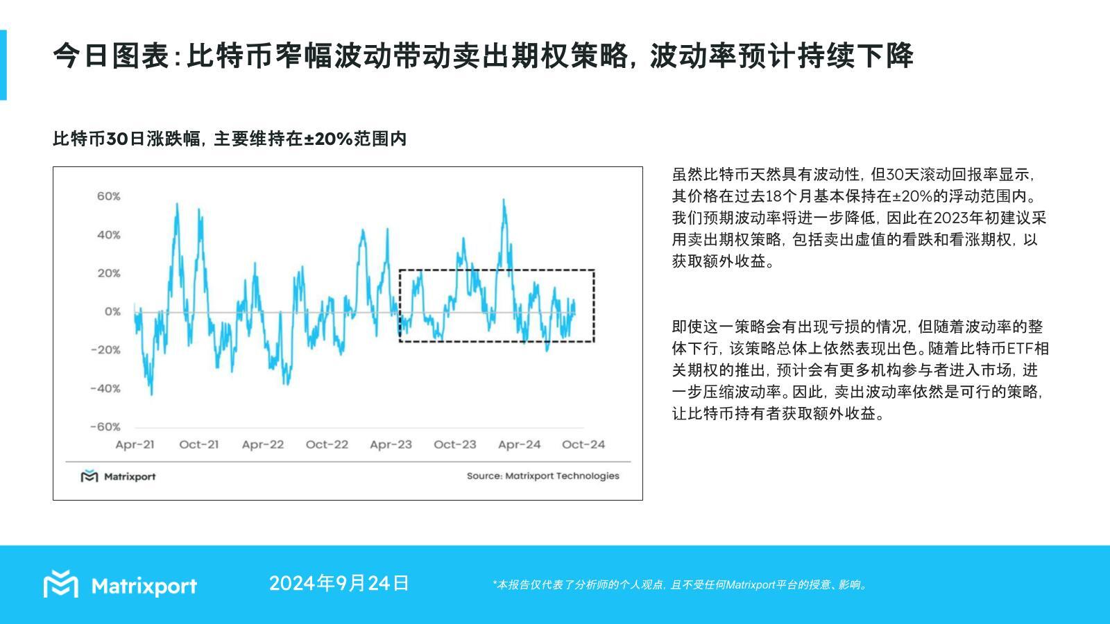 另外,Matrixport 昨日也在推特上发布最新研究 报告 ,称比特币的价格在过去的 18 个月内,基本维持在上下 20% 的波动范围,而随著比特币 ETF 相关期权的推出、机构参与者的加入,比特币的波动率将进一步被压缩,因此建议投资者采用卖出波动率的策略获得额外收益: