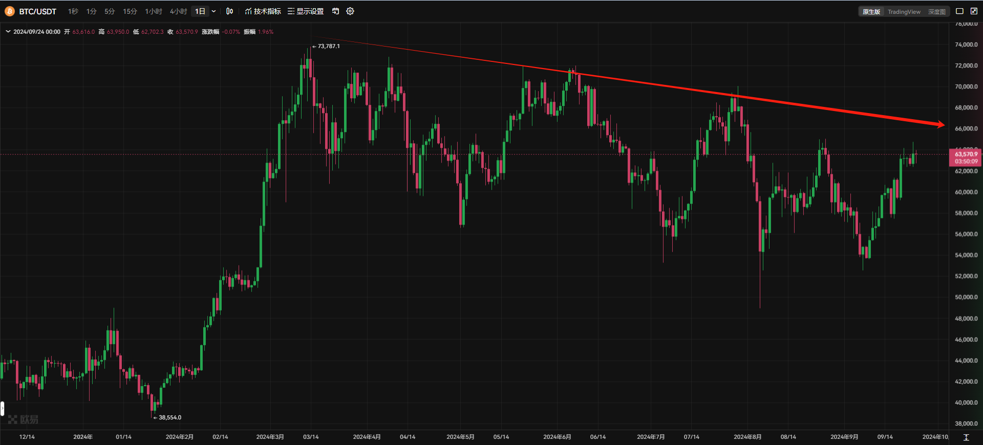目前比特币距离这一阻力位已经很近了,这个点位之所以重要,是因为比特币自今年 3 月 14 日创下 73,666 美元的历史新高以来,一直处于下跌趋势;而 65,200 美元关卡,是 9 月初下跌前的一次高点,这一位置突破后,则意味著底部正式形成。