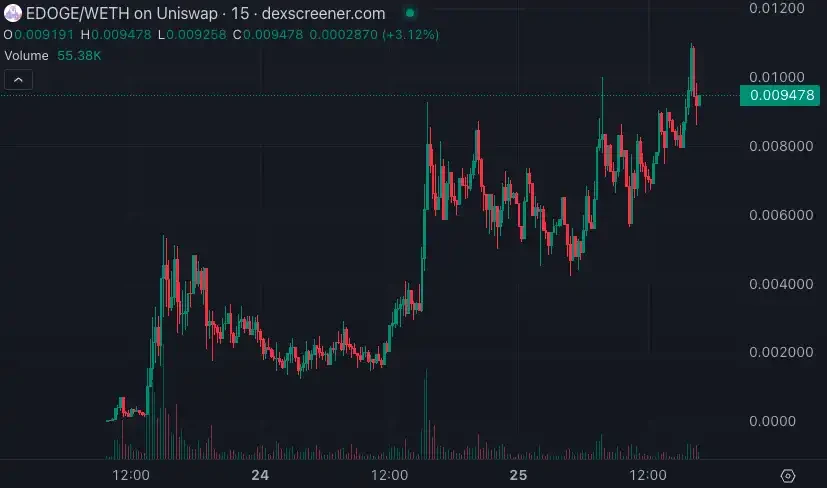大小写 Neiro 先后上线 Binance 合约和现货后,许多「链上野庄」和 meme 玩家看到了新的行情机会,其中不少抓住了这波泼天流量,先后出现了 MOODENG、TERMINUS、EDOGE 等十倍甚至百倍金狗。随着 meme 行情的持续发酵,以太坊再次开启了狗狗 meme 的生产流水线,再演「百狗狂吠」的经典场面。