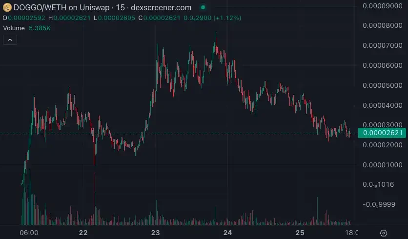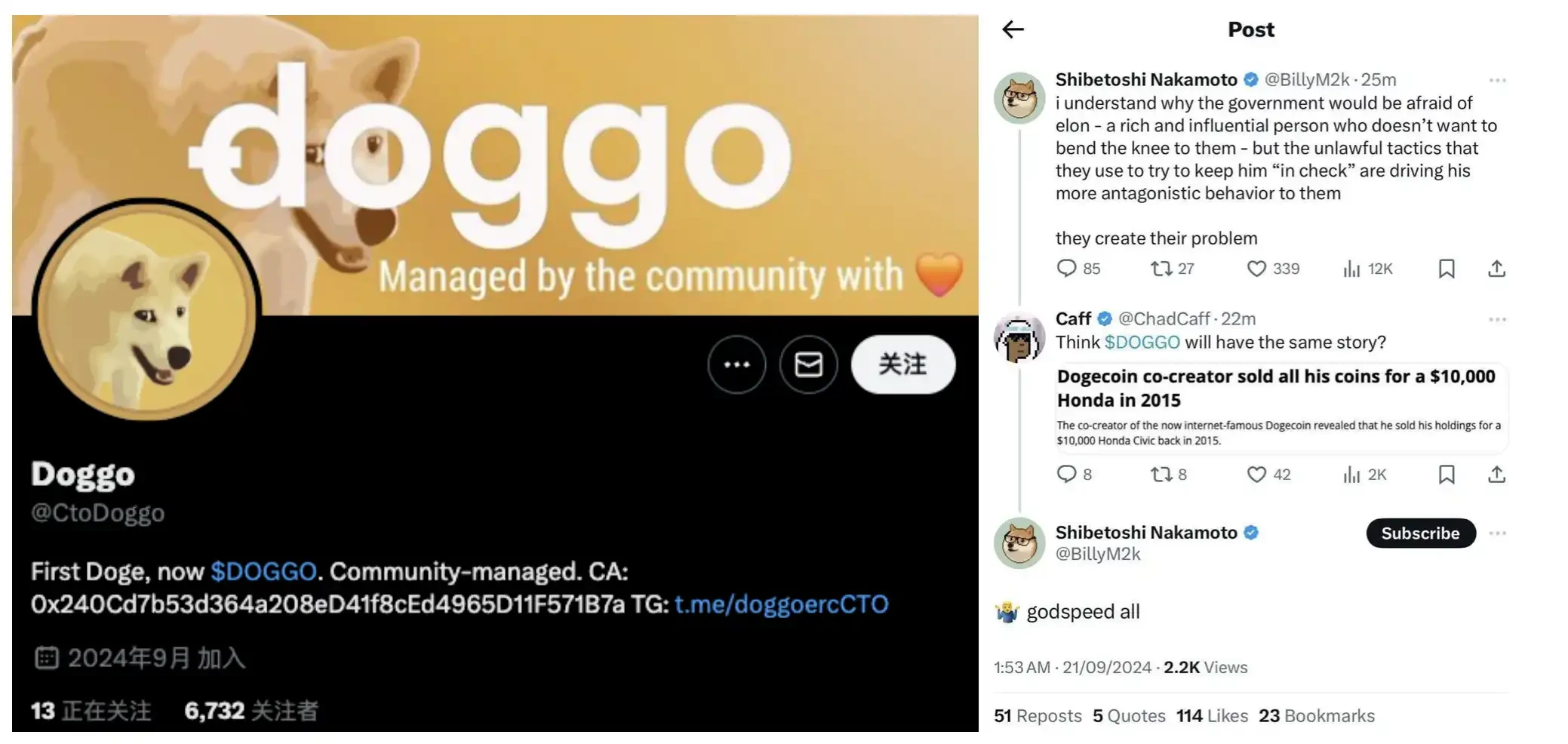9 月 20 日,狗币创始人 Shibetoshi Nakamoto(@BillyM 2 k)在 X 上发了一段弱智狗的视频并附言:what happened to poor doggo?随后便有团队发行了$DOGGO 代币,并将 6.56% 的 $DOGGO 代币打给 Shibetoshi,随后 Shibetoshi 便将手中的 $DOGGO 全部卖出。「创始人卖飞」的故事让$DOGGO 立刻火爆,但在次日 Shibetoshi 否认对 $DOGGO 的背书后,该 meme 代币便一蹶不振。