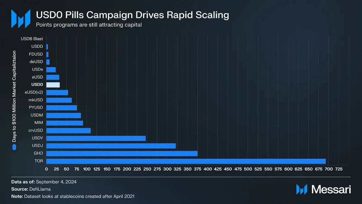 像 USD 0 这样的更去中心化的由财政支持的稳定币,通过空投激励和与 DeFi 平台(如 Morpho)的合作集成迅速增长。USD 0 的市值约为 2.5 亿美元,并且快速达到了这一水平:
