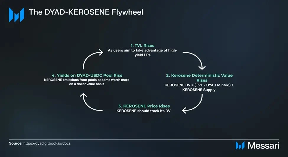-> 2. KEROSENE 确定性价值上升 - KEROSENE 的确定性价值 (DV) 计算公式为:KEROSENE DV = (TVL - 已铸造的 DYAD) / KEROSENE 供应量。