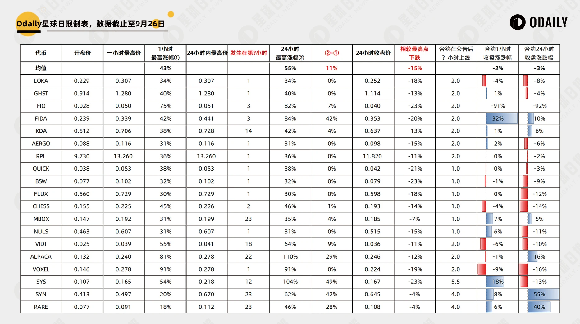 数据总结: 1 小时最高涨幅与上一小节一致,均值为 43% ;24 小时最高涨幅进一步提升,均值上升至 55% ,但主要为早期的 ALPACA、SYS、SYNC 等贡献;高点跌幅也有所扩大,下跌均值 15% 。