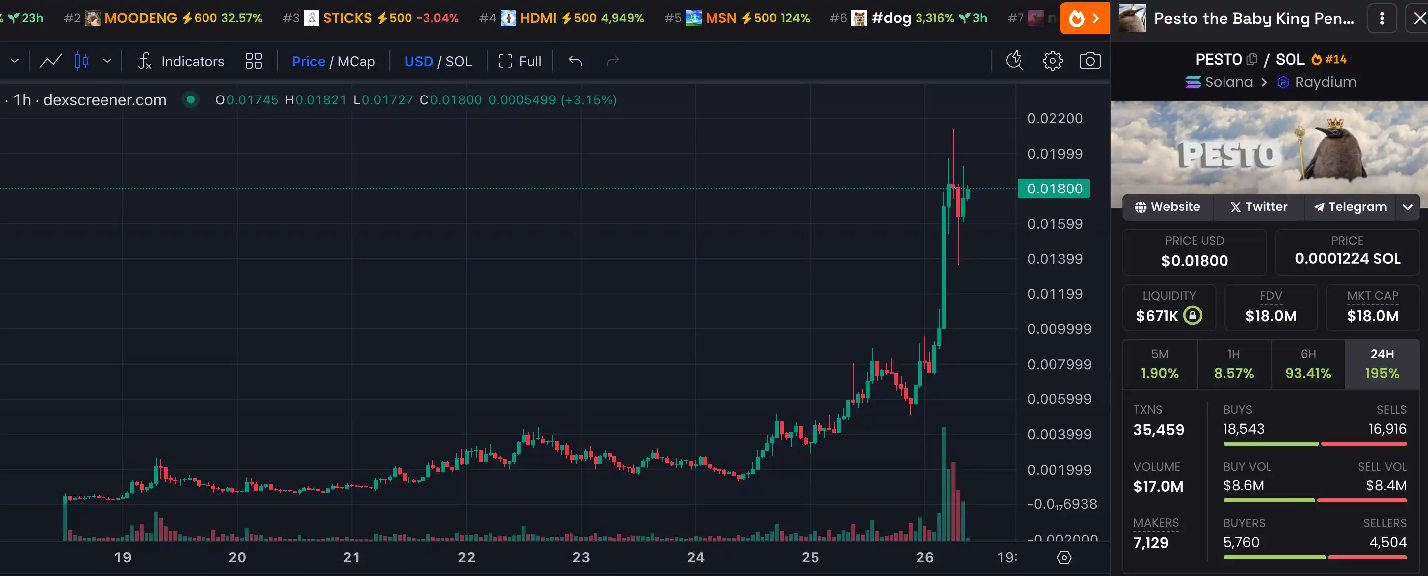 $PESTO 是一只来自澳大利亚的萌物巨型帝企鹅 Pesto,Pesto 在 Web2 的火热程度直追河马 Moodeng,MOODENG 引起 meme 社区注意后,PESTO 也成为了「龙二」标的,Solana 上的$PESTO 上线于 9 月 18 日,表现强势。上线后涨幅超 8 倍。之后的一天遭遇大幅回调,日跌幅超 80% ,市值跌破一百万美元。昨日晚间,PESTO 开始拉盘,至今日上午涨幅超 300% 。