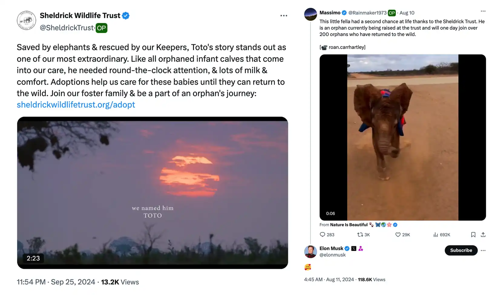 TOTO 是一只被慈善动物保护信托基金 SheldrickTrust 所救助的小象,马斯克曾在 8 月 11 日回复过 TOTO 被救助的推文,TOTO 代币上线于 19 日,市值在突破 1 M 美元后持续下跌,昨日晚,TOTO 的救助组织 Sheldrick Wildlife Trust 发布了 TOTO 回顾视频,meme 社区的 TOTO 喊单也密集出现,三个小时后,TOTO 开启暴涨。