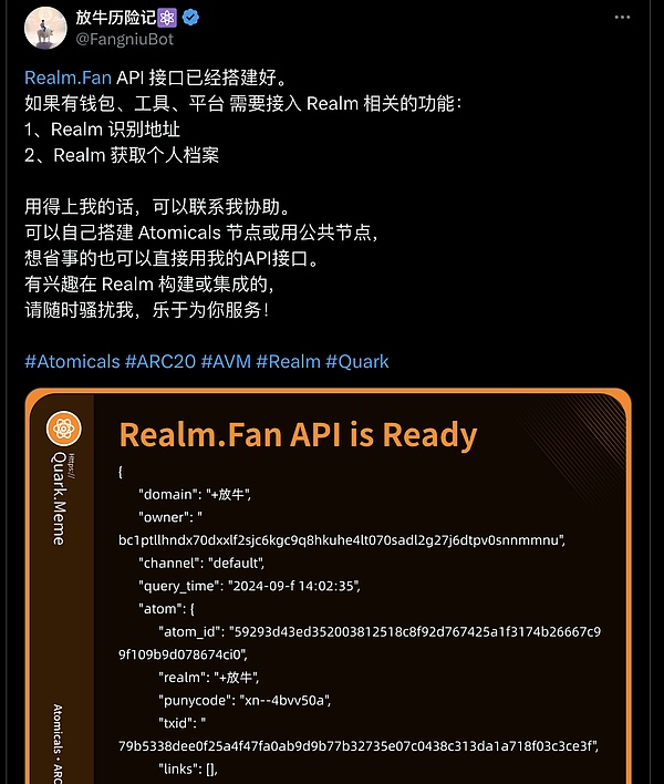-Realm. Fan API 接口已经搭建完成。如果有钱包、工具、平台 需要接入 Realm 相关的功能,Realm 识别地址,Realm 获取个人档案。欢迎联系