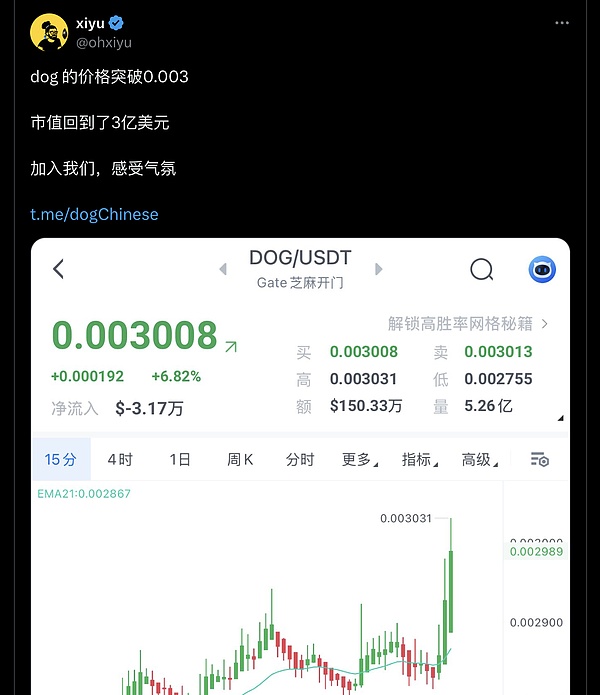 - $DOG 价格突破 0.003 u,市值重回 3 亿美金