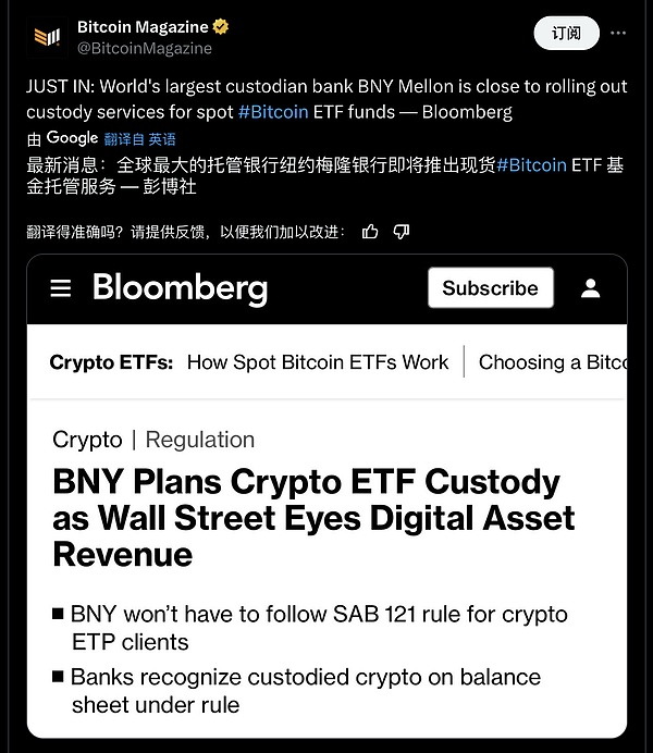 - 全球最大的托管银行纽约梅隆银行即将推出现货#Bitcoin ETF 基金托管服务 — 彭博社