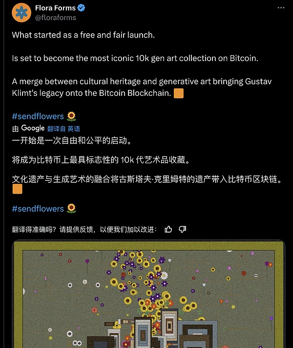 Flora @floraforms 将成为比特币上最具标志性的 10 k Ordinals 艺术品收藏。文化遗产与生成艺术的融合将古斯塔夫·克里姆特的遗产带入比特币区块链。 ?