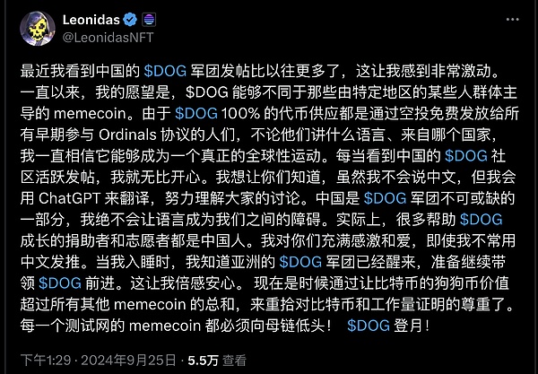 - Leon @LeonidasNFT 发中文推支持$DOG 中文社区