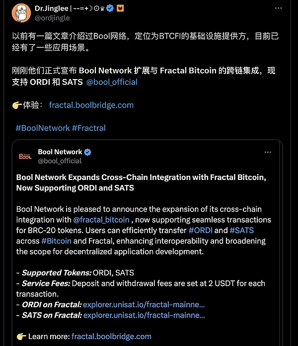 正式宣布 Bool Network @bool_official 扩展与 Fractal @FractalBitcoin 的跨链集成,现支持 $ORDI 和 $SATS