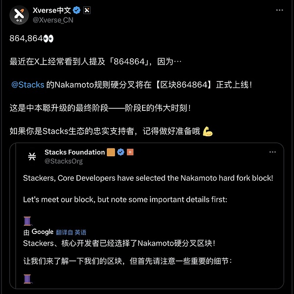 - @Stacks 的 Nakamoto 规则硬分叉将在区块 864864 正式上线