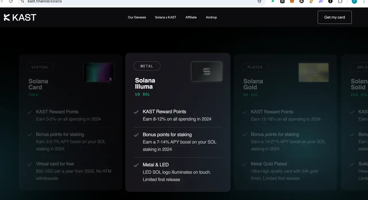 在 Solana Breakpoint 大会上,Kast 推出了专属 Solana 生态的四种等级支付卡,即 Solana Card(Free)、Solana Illuma(10 sol)、Solana Gold(50 sol)、Solana Solid(250 sol),每种等级对应不同的成本和收益。