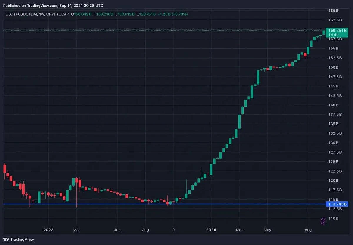 整体稳定币供应量接近历史最高水平 $ 1604 亿。
