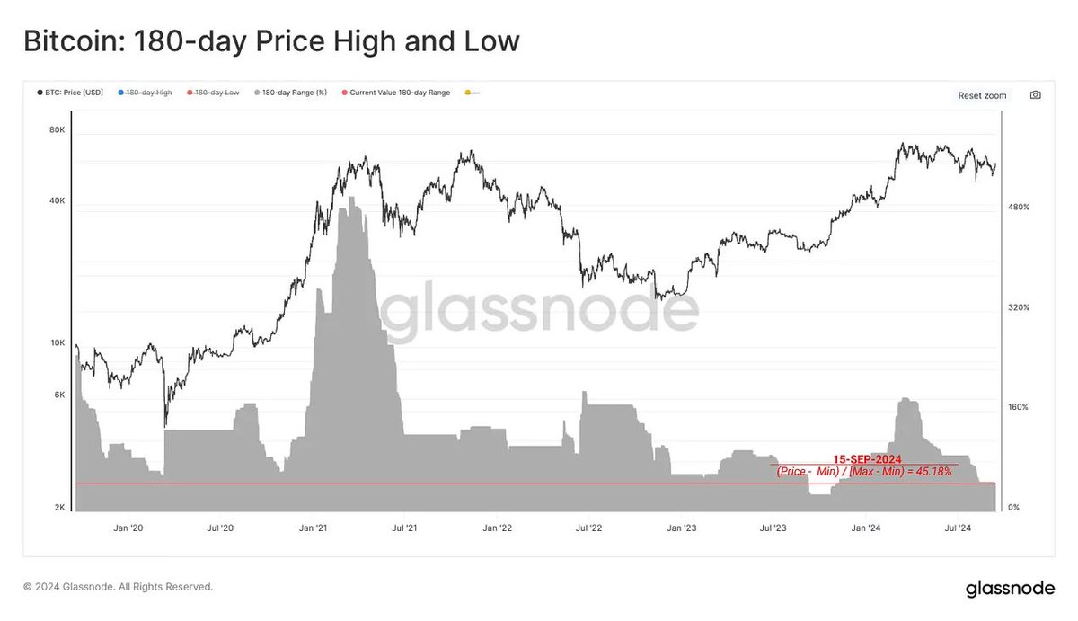 实际上,只有 2023 年 8 月和 2016 年 5 月的 BTC 价格范围更紧缩,持续了 180 天。